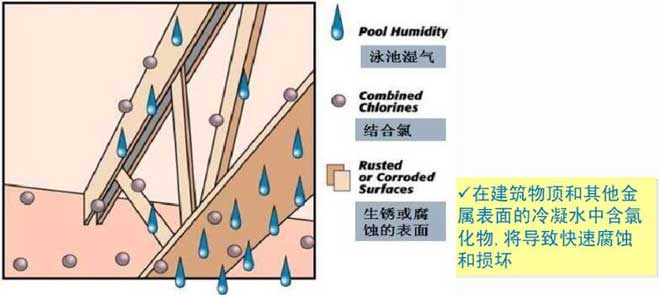 室內游泳池由于池水表面蒸發容易使室內充滿潮濕含氯的空氣,當潮濕含氯的空氣遇到較冷物體就會凝結出冷凝水,由于冷凝水含有大量的氯,將會腐蝕所接觸到的建筑物,如使裝修面層生銹、起鼓、掉漆等,嚴重的時候回因腐蝕到受力鋼筋,使之抗拉強度降低而斷裂,造成房屋垮塌等危險。這情況在發達國家增發生過多次。