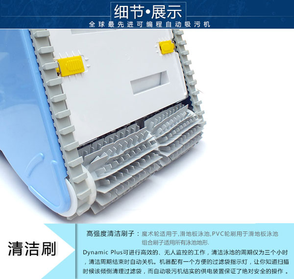 20米帶線長,帶推車,帶24V直流電變壓器,帶遙控器,爬墻智能型,電纜帶防糾纏器,變壓器帶過載指示燈,主機帶記憶芯片,遙控器帶遍程功能。20米線長,全智能帶無線遙控器,能爬墻,可在無人看管的情況下對游泳池底部及池壁進行徹底刷洗,電纜帶萬向節(jié)可防電線纏繞,適用于長度為20米至30米的泳池。