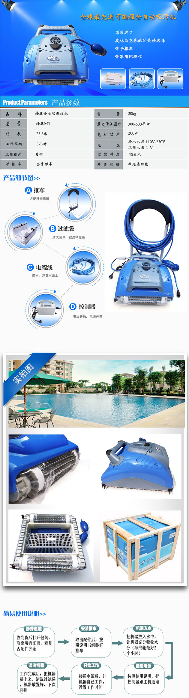 海豚M3全自動泳池吸污機能夠給你提供一個數(shù)小時干凈、清澈、衛(wèi)生的泳池享受。